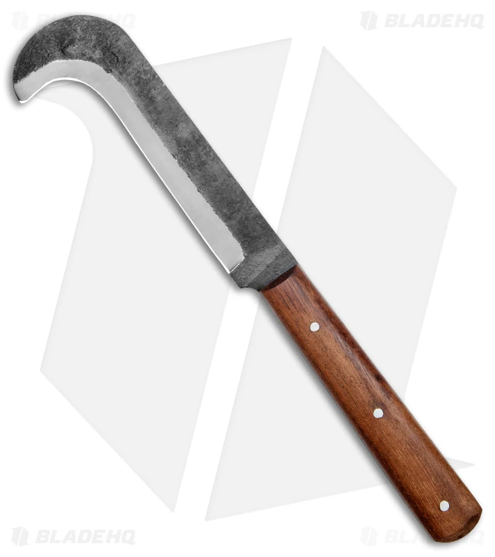 The Pakistan Bill Hook Machete is a fixed blade knife used for chopping around objects like tree trunks and plants. Its hooked blade comes with a brown leather sheath to match its blade shape.